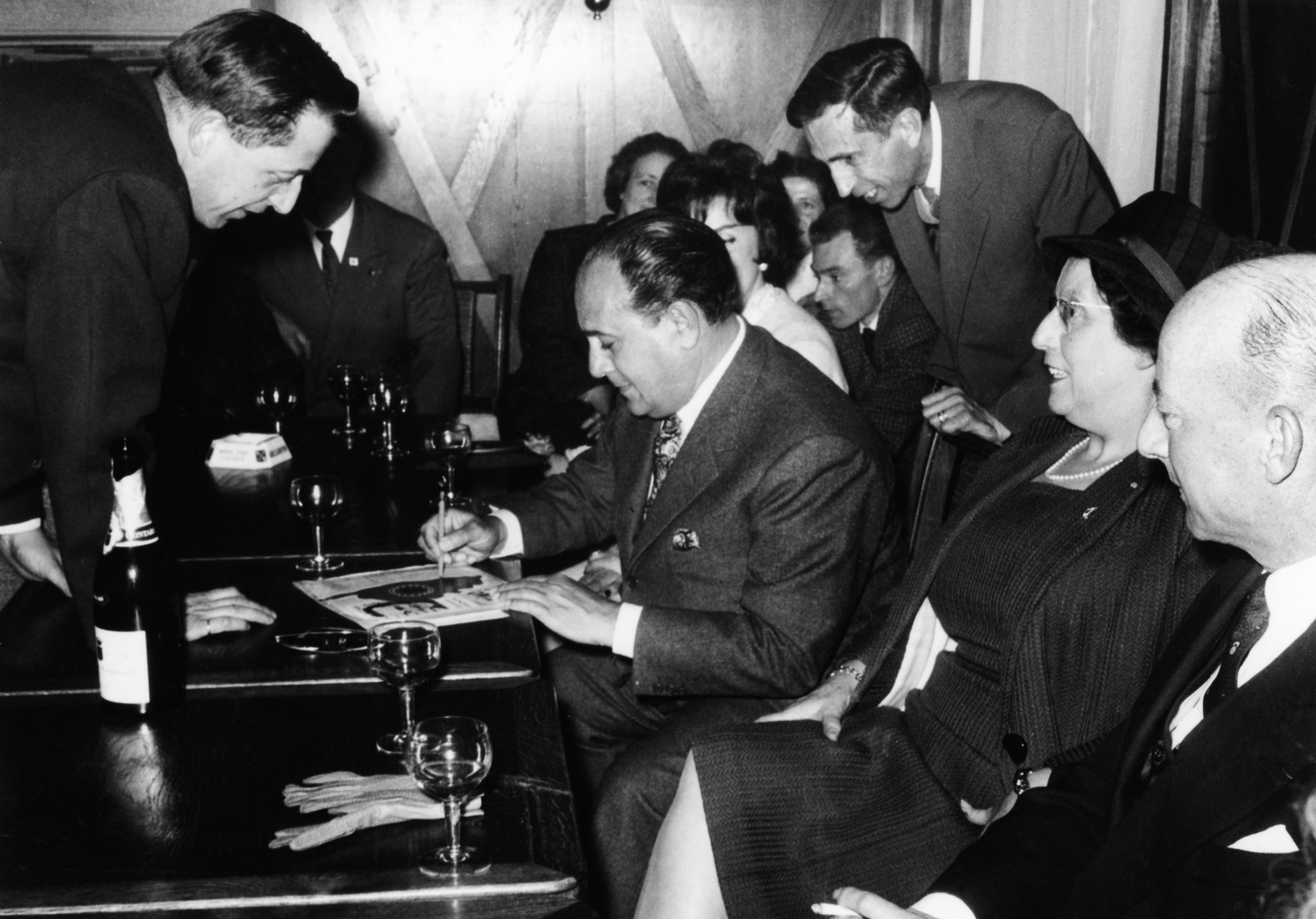 Ci-dessus : Jacques Anquetil, Tino Rossi, Mathé Altéry et Luis Mariano autour d’Yvette Horner qui fête ce soir là son 10 millionième disque vendu, dans un restaurant à proximité des Champs-Élysées.