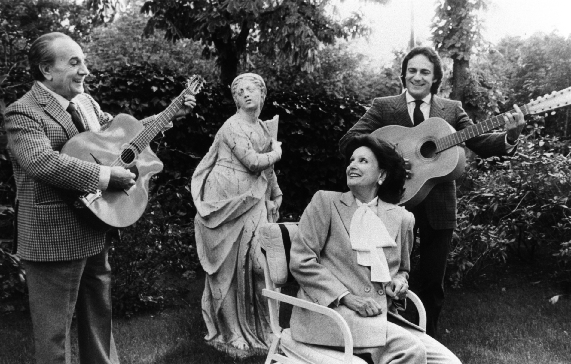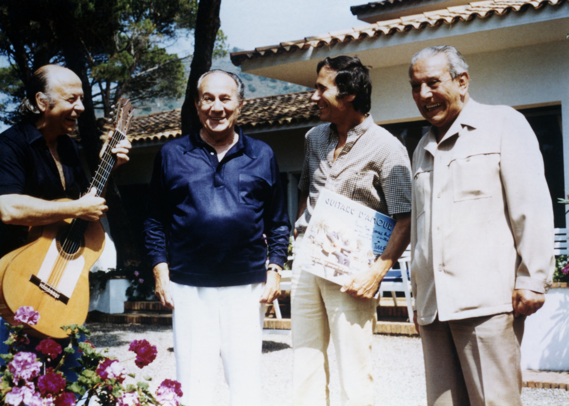 Ci-dessus : Tino Rossi en vacances à Ajaccio, recevant chez lui, au Scudo, les frères Paulo et Pierre Quilici, à l’occasion de la sortie de leur 33 tours Guitare d’Amour, jouant les plus grands succès de Tino.