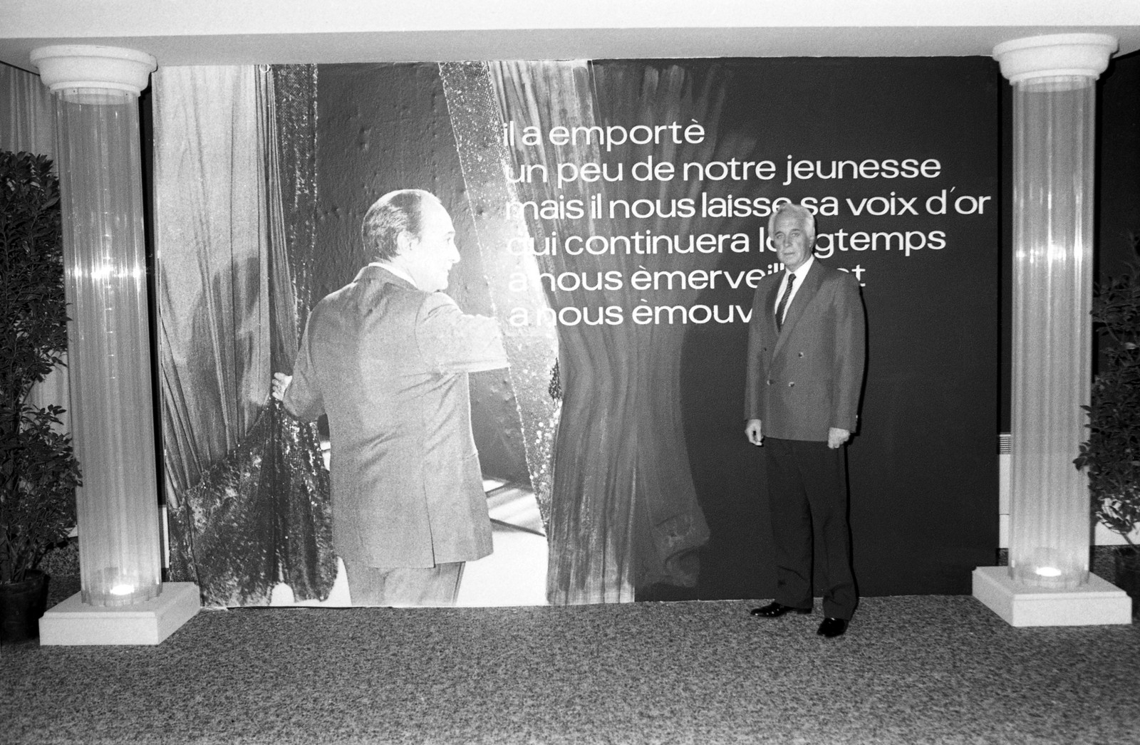 - cliché A12 : M. Henri Porcq (Président honoraire du Club Tino Rossi) devant Tino Rossi grandeur nature, au Casino de Paris.