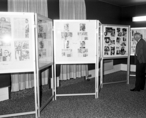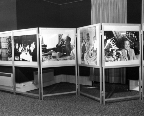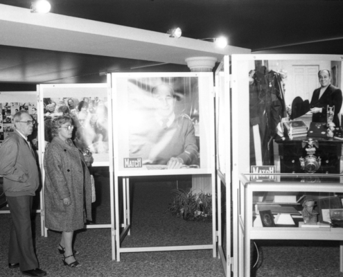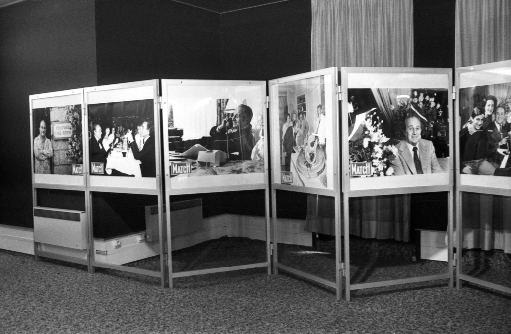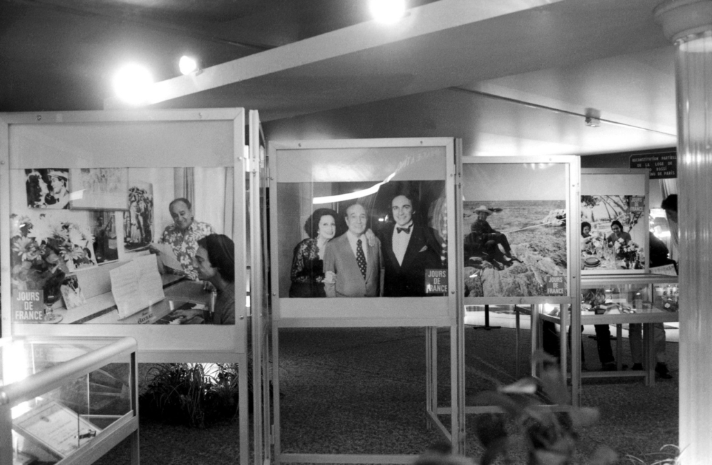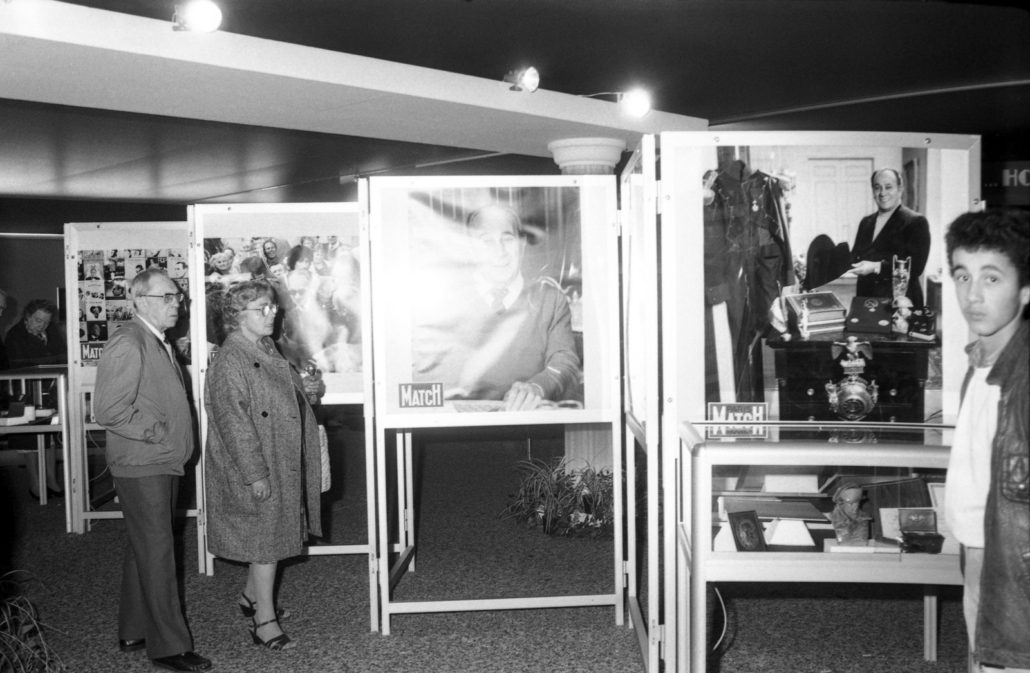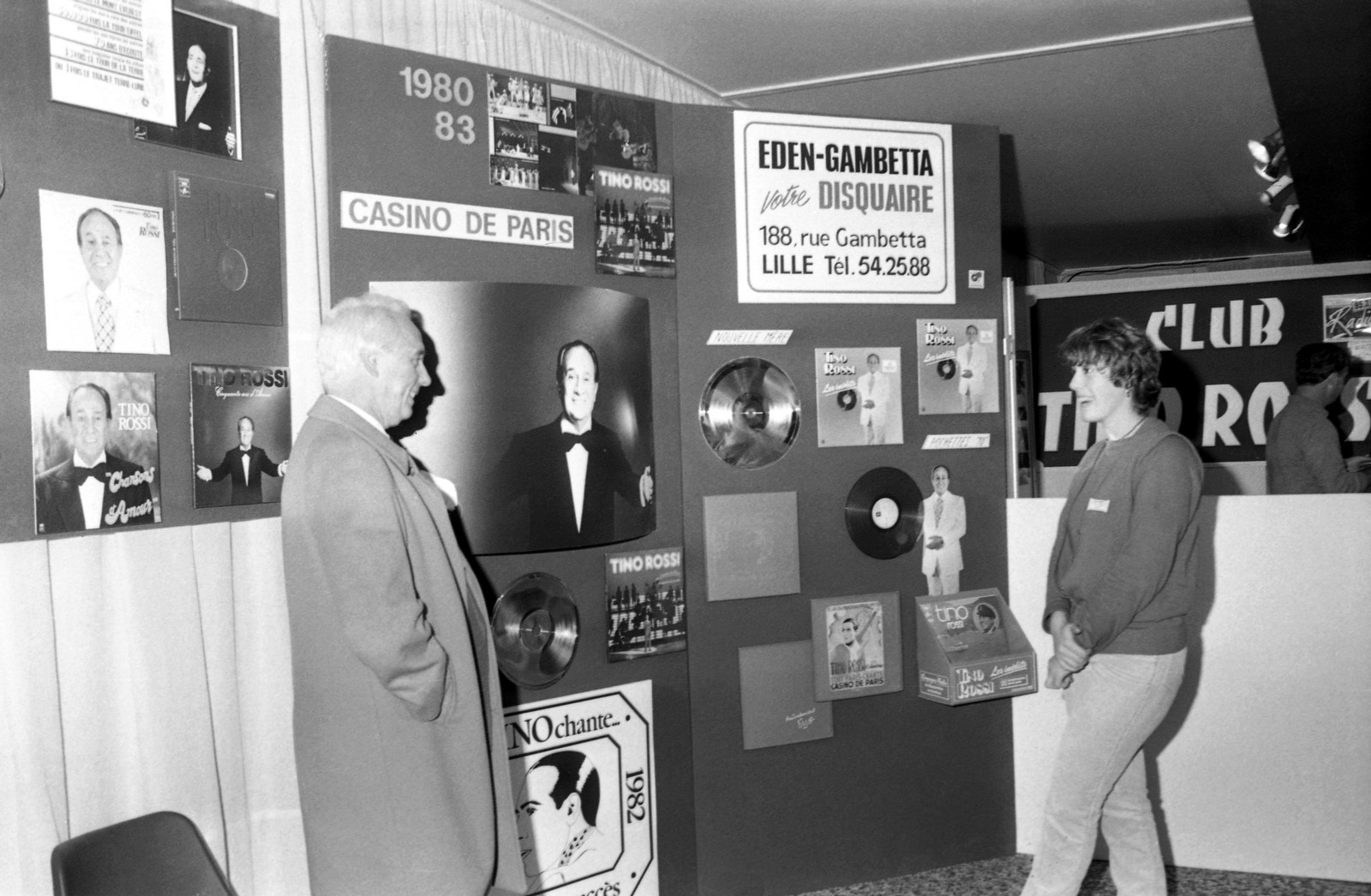 - clichés 1 & 2 : dernier jour de l’exposition (11 novembre 1984), en présence de M. Henri Porcq (Président honoraire du Club Tino Rossi) – en imperméable beige.