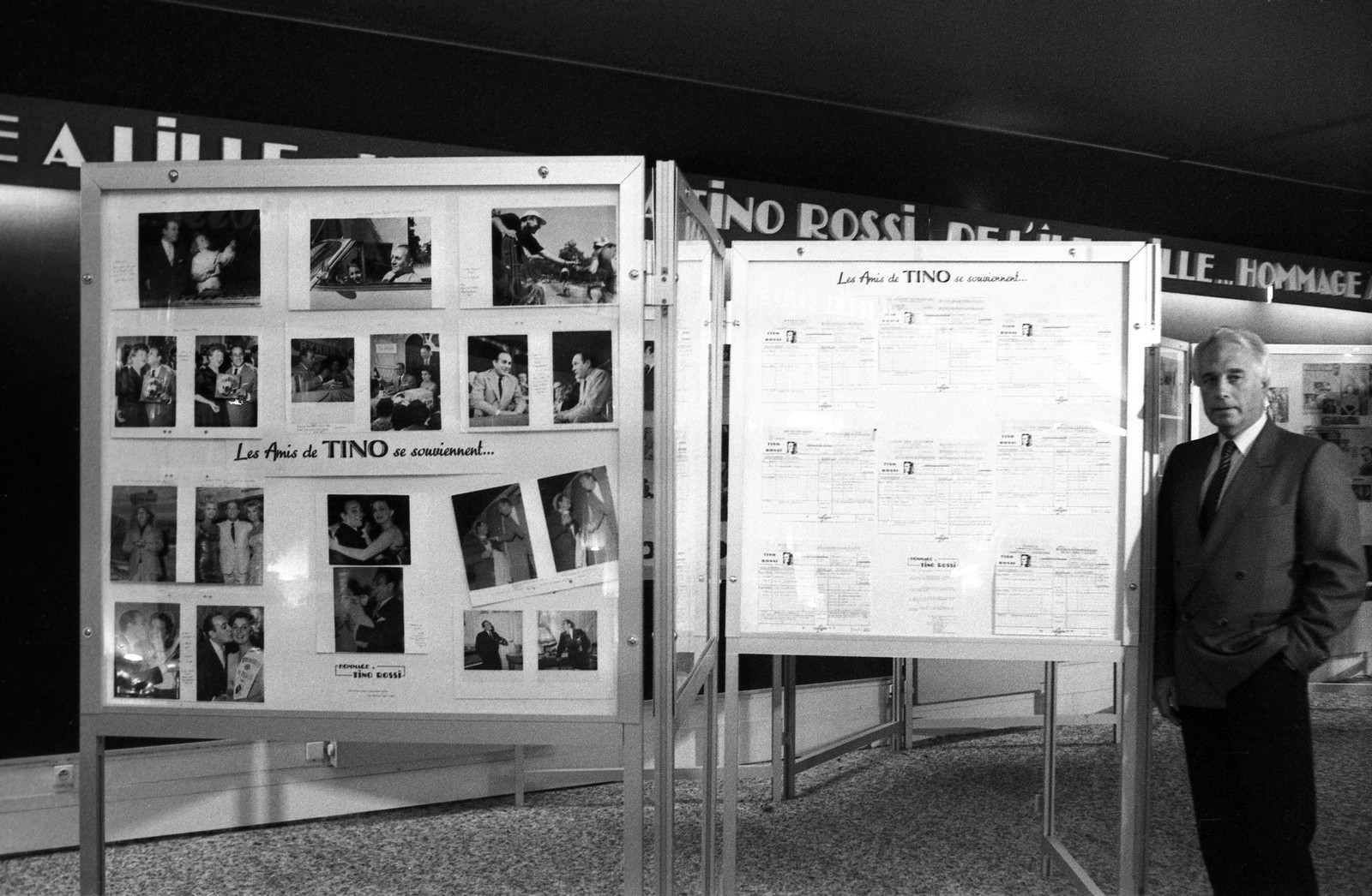 - clichés A16, A17, A21, A24, A25, A27, A33, A37 : M. Henri Porcq (Président honoraire du Club Tino Rossi) présente les nombreux panneaux d’exposition qui relatent la vie et de l’œuvre artistique de Tino Rossi.