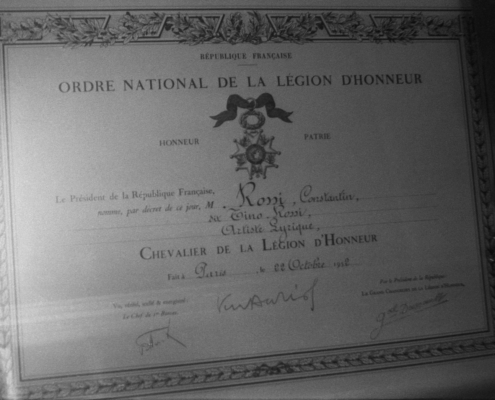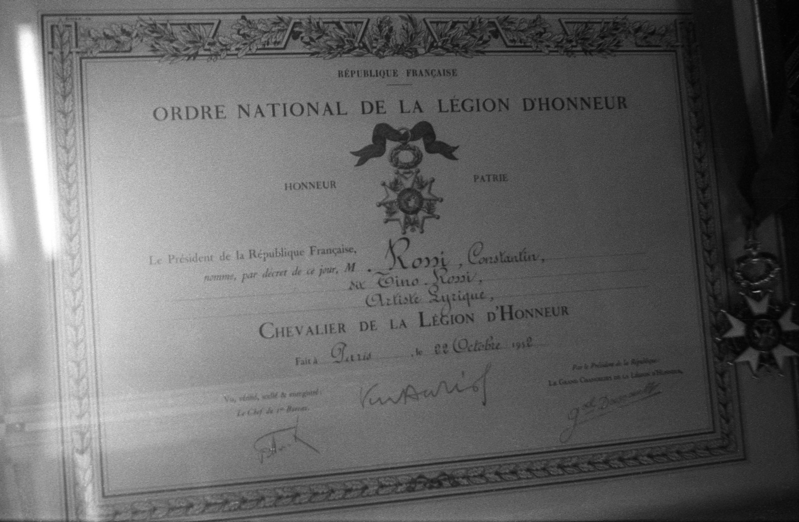 - cliché B03 : diplôme de Chevalier de la Légion d’Honneur attribué à Tino Rossi en 1952, par M. le Président de la République – Vincent Auriol.